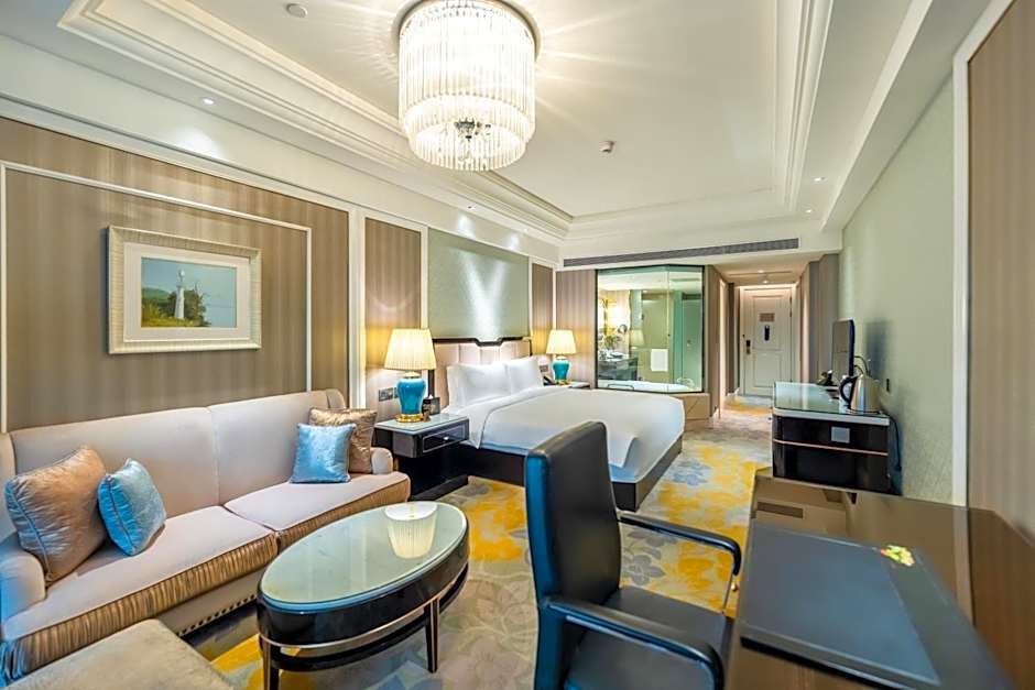 This suite has a seating area, an electric kettle, sofa and bathrobe.